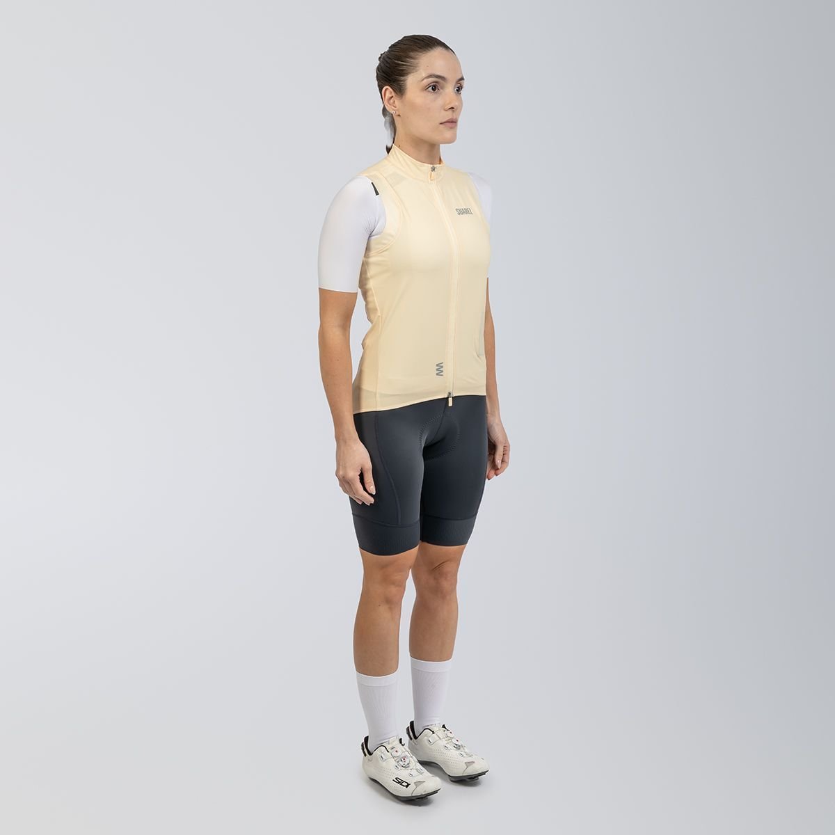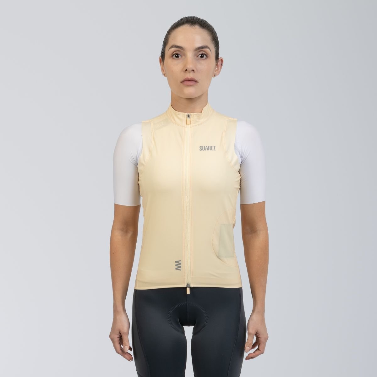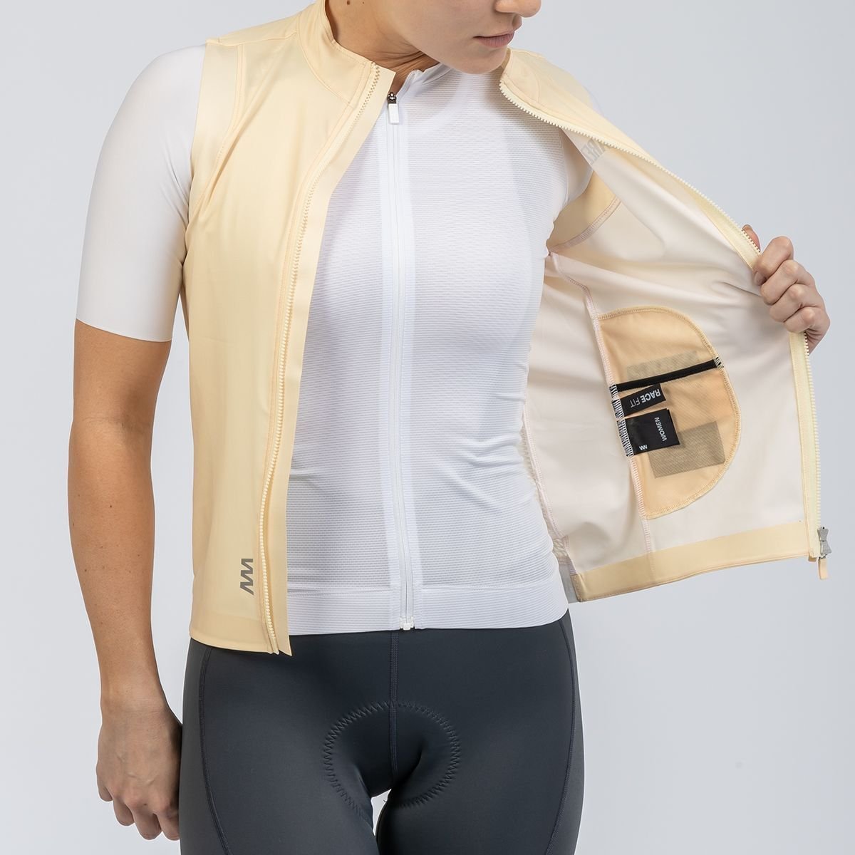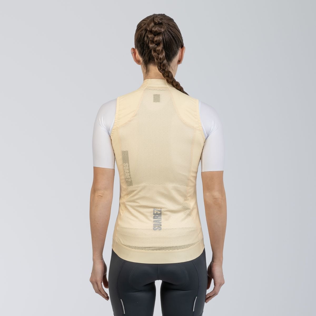 Acabamento termo selado e grip antiderrapante que mantêm o colete no lugar sem atrapalhar a pedalada.