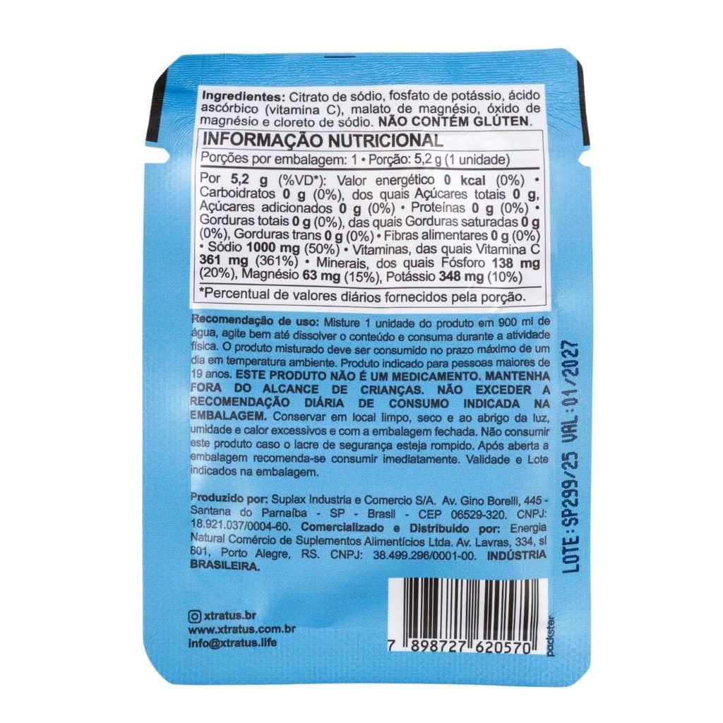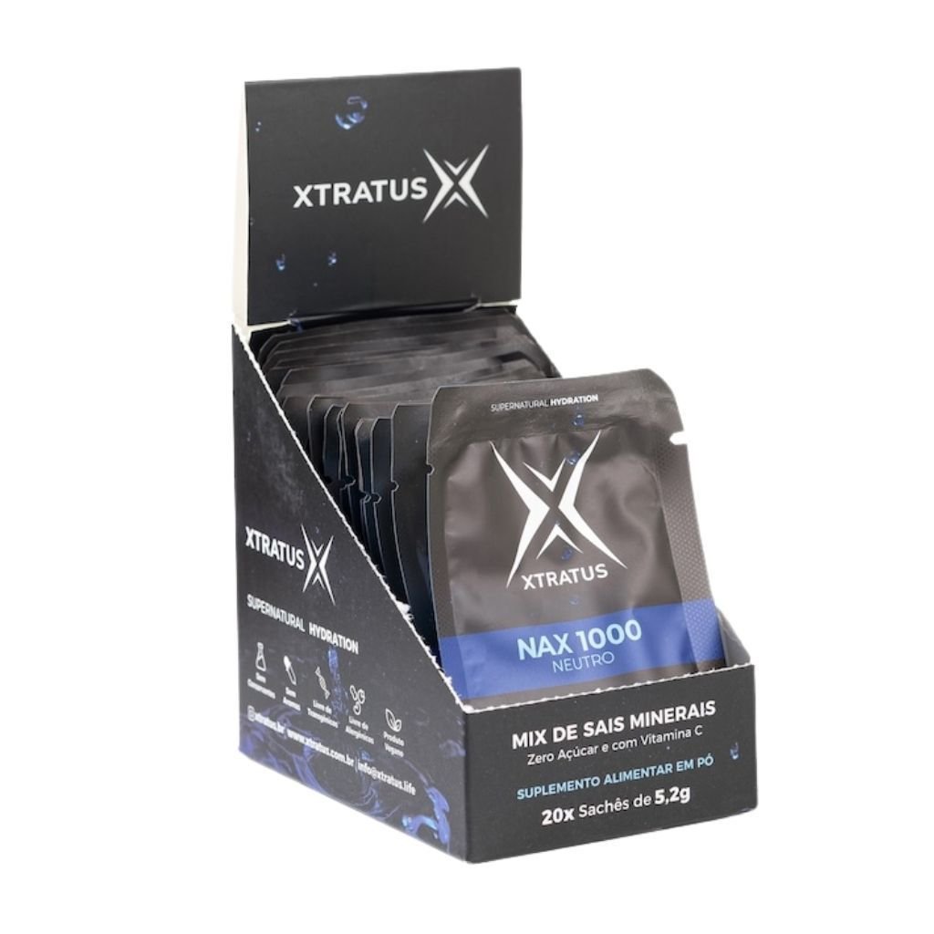 O NaX Xtratus é o mix de sais minerais da Xtratus desenvolvido para quem busca hidratação rápida, eficiente e sem aditivos desnecessários. Sua fórmula é limpa: sem aromas artificiais, corantes ou conservantes, e combina Sódio, Magnésio, Potássio, Fósforo e Vitamina C em proporções ideais para repor o que o corpo perde no suor, manter a performance e acelerar a recuperação.