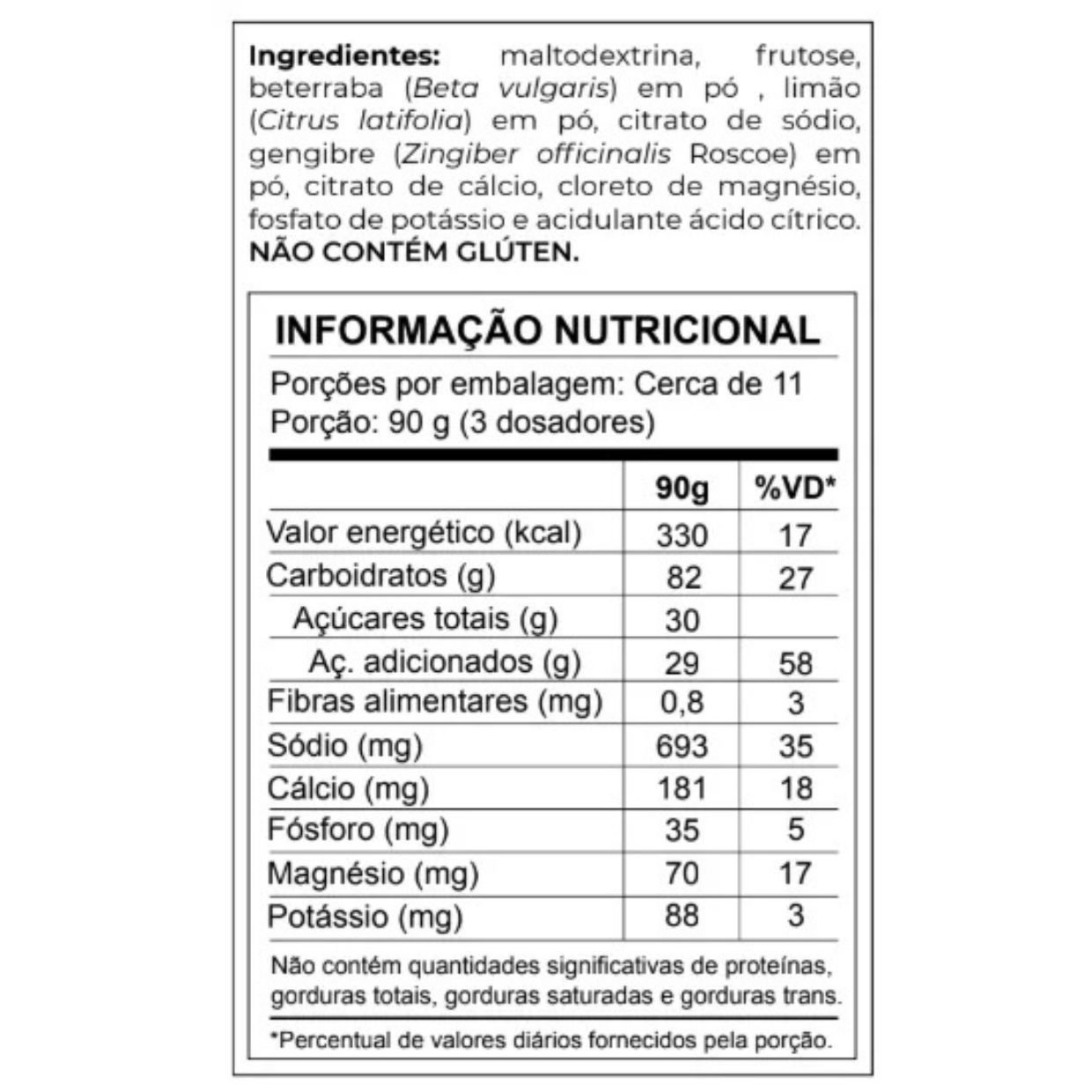 Maltodextrina, frutose, beterraba em pó (Beta vulgaris), limão em pó (Citrus latifolia), gengibre em pó (Zingiber officinalis Roscoe), minerais (citrato de sódio, cloreto de magnésio, citrato de cálcio, fosfato de potássio), acidulante ácido cítrico.